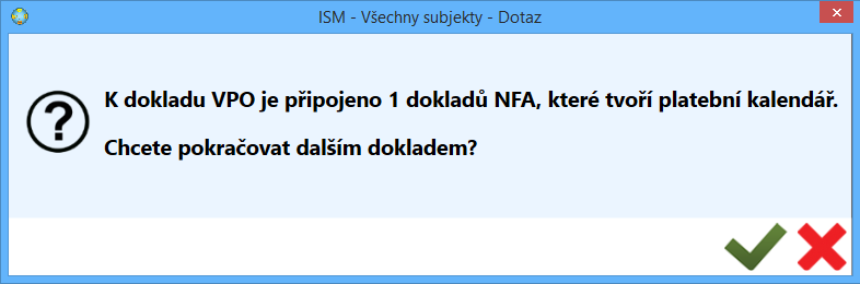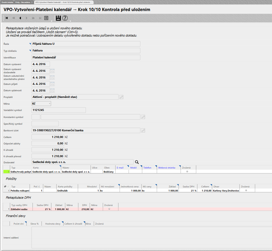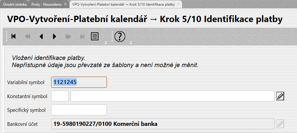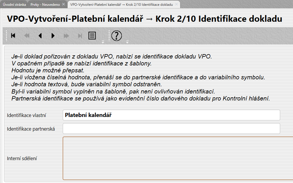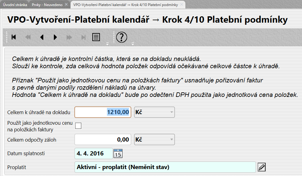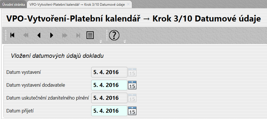 Po zahájení aktivity se zobrazí nejdříve informace o dokladu VPO a otevře se detail dokumentu pro pořízení platebního kalendáře. Po uložení průvodce VPO se zobrazí dialog pro zadání inicializačních údajů pro vytvoření platebního kalendáře.