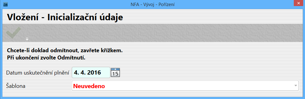 Po zahájení aktivity se zobrazí nejdříve informace o dokladu VPO a otevře se detail dokumentu pro pořízení platebního kalendáře. Po uložení průvodce VPO se zobrazí dialog pro zadání inicializačních údajů pro vytvoření platebního kalendáře.