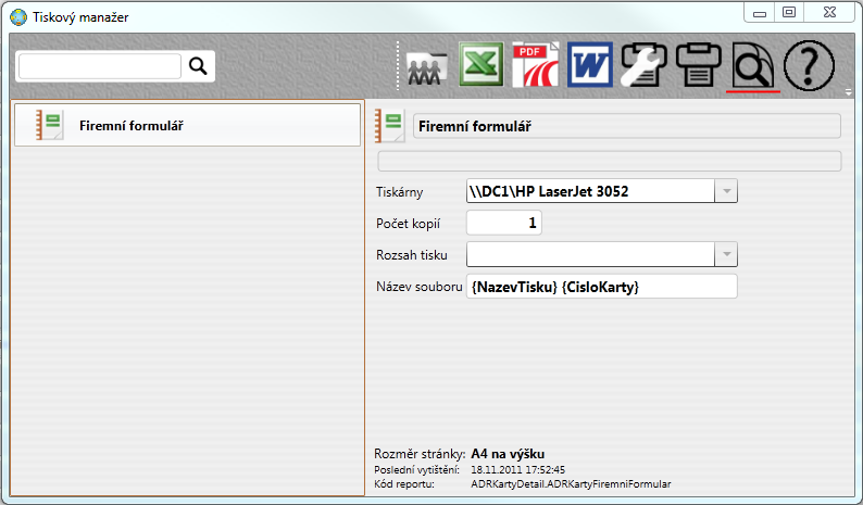 Tiskový manažer slouží k výběru připravené tiskové sestavy pro detail, nebo seznam.