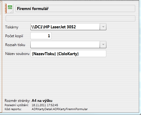 - Název souboru - Vlastnost pro export tisku do souboru. Vlastnost určuje z jakých údajů se bude skládat název vytvořeného souboru. Při nastavení {NazevTisku} {CisloKarty} bude vypadat název souboru např.: "Firemní formulář S0000017.pdf"