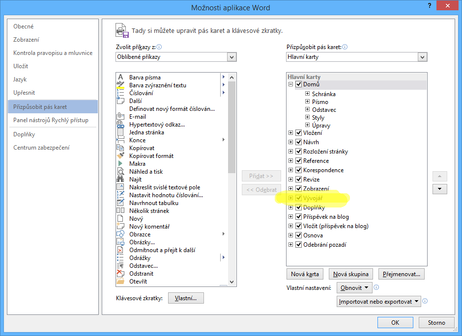 Ovládací prvky fungují tak, že se text vkládá namísto ovládacího prvku. Pro vkládání ovl. prvků je potřeba v aplikaci Word nejprve povolit záložku Vývojář.