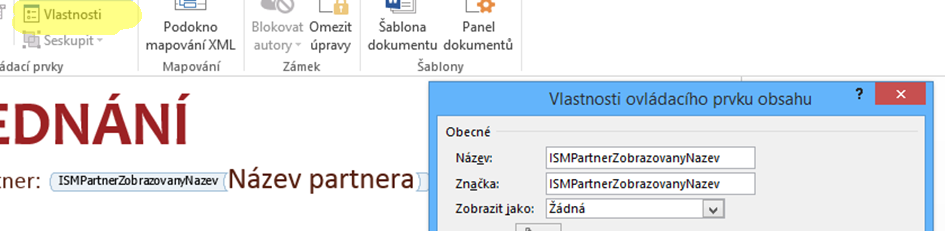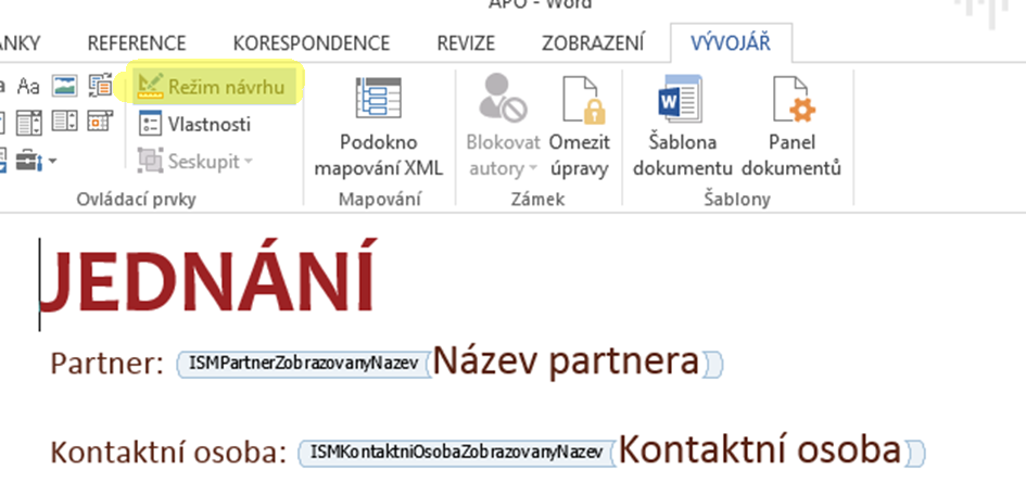 V šabloně se připravují ovládací prvky, které mají předem daný kód. Tyto prvky jsou v aplikaci nahrazovány požadovaným obsahem (Název subjektu, partnera…).