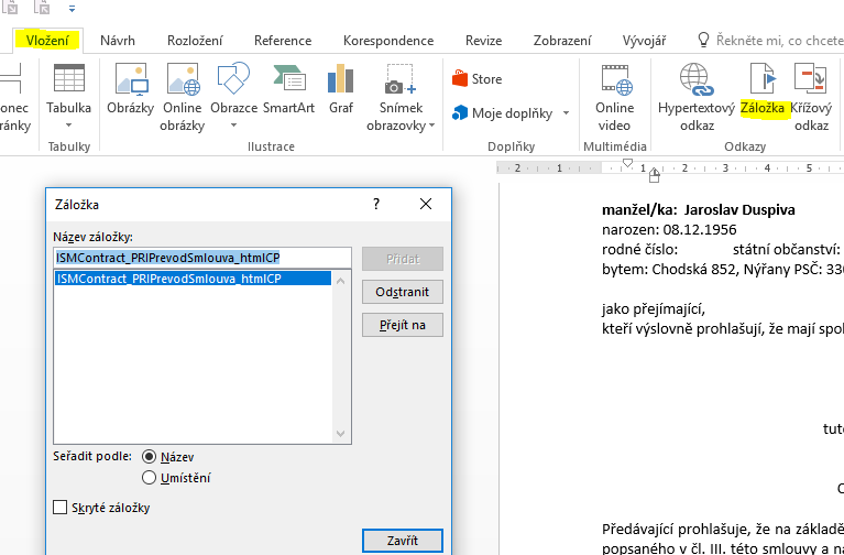 Záložky se vkládají pomocí volby "Vložení - Záložka". Omezení délky kódu je 40 znaků!